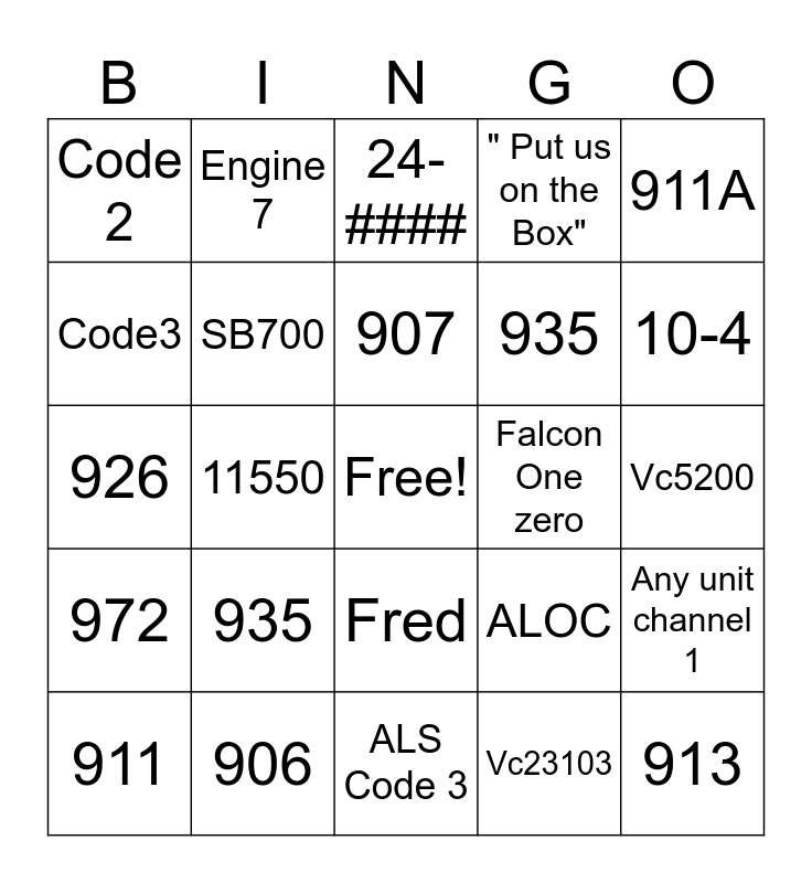 This bingo card has a free space and 24 words: 935, 906, 907, 911, 911A, Code 2, Code3, Engine 7, Falcon One zero, Fred, 935, 926, ALOC, Any unit channel 1, SB700, Vc23103, Vc5200, 24-####, 10-4, 11550, 913, 972, " Put us on the Box" and ALS Code 3.