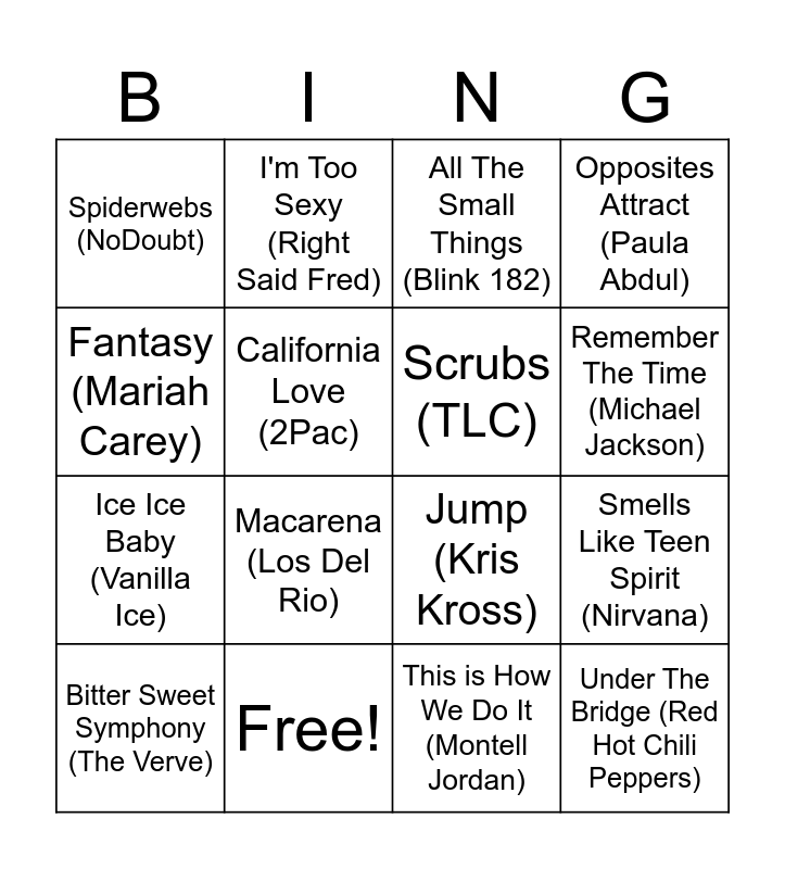 This bingo card has 16 words: Free!, Smells Like Teen Spirit (Nirvana), All The Small Things (Blink 182), Spiderwebs (NoDoubt), Ice Ice Baby (Vanilla Ice), I'm Too Sexy (Right Said Fred), Jump (Kris Kross), This is How We Do It (Montell Jordan), Fantasy (Mariah Carey), California Love (2Pac), Bitter Sweet Symphony (The Verve), Opposites Attract (Paula Abdul), Macarena (Los Del Rio), Remember The Time (Michael Jackson), Scrubs (TLC) and Under The Bridge (Red Hot Chili Peppers).