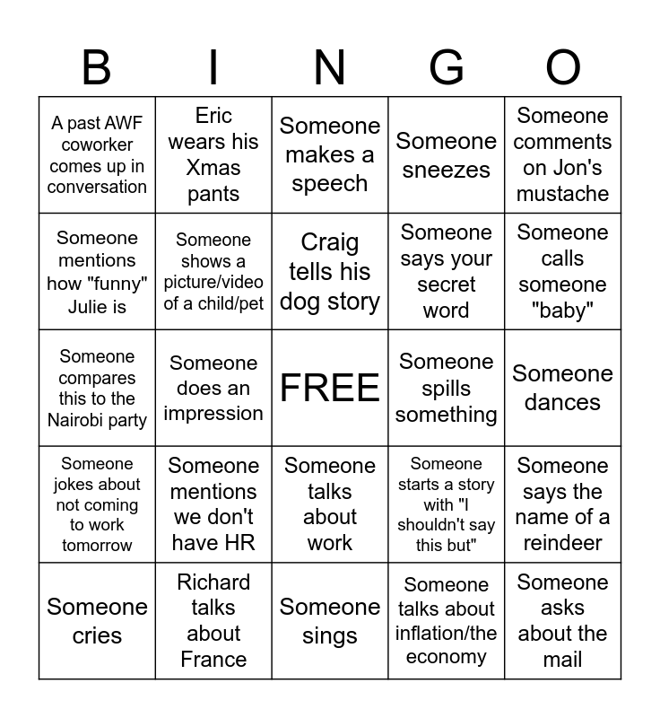This bingo card has a free space and 24 words: Someone mentions we don't have HR, Richard talks about France, Craig tells his dog story, Someone cries, Someone comments on Jon's mustache, A past AWF coworker comes up in conversation, Someone mentions how "funny" Julie is, Eric wears his Xmas pants, Someone spills something, Someone talks about work, Someone says your secret word, Someone compares this to the Nairobi party, Someone starts a story with "I shouldn't say this but", Someone says the name of a reindeer, Someone shows a picture/video of a child/pet, Someone talks about inflation/the economy, Someone dances, Someone makes a speech, Someone calls someone "baby", Someone does an impression, Someone asks about the mail, Someone jokes about not coming to work tomorrow, Someone sneezes and Someone sings.