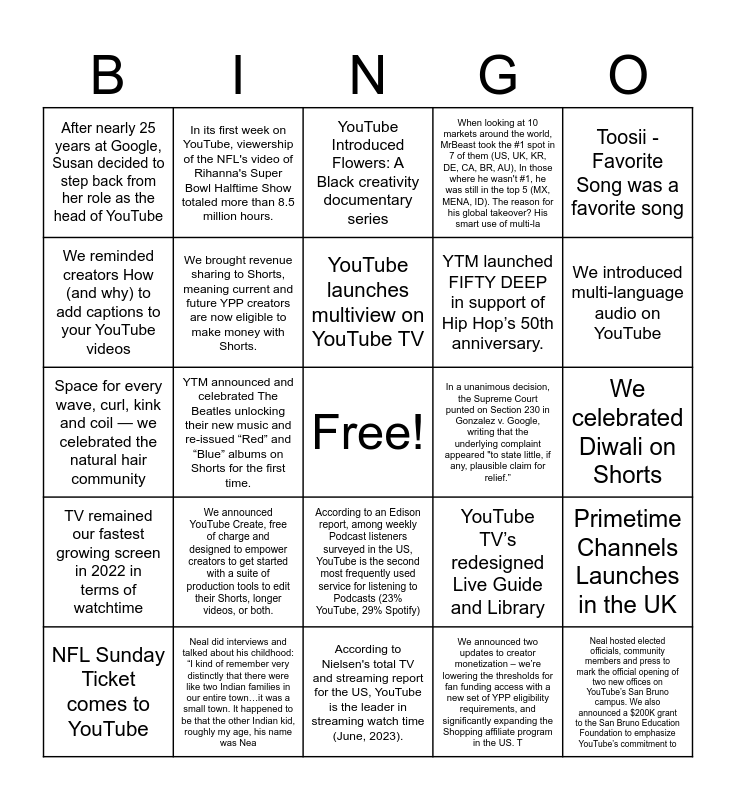 This bingo card has a free space and 57 words: YouTube shares principled approach for children and teenagers, NFL Sunday Ticket comes to YouTube, YouTube TV (Google) wins first Technical Emmy® Award for Views feature, After nearly 25 years at Google, Susan decided to step back from her role as the head of YouTube, According to Nielsen's total TV and streaming report for the US, YouTube is the leader in streaming watch time (June, 2023)., YouTube is the platform most commonly used by teens, with 95% of those ages 13 to 17 saying they have ever used it, according to a Pew Center survey conducted April 14-May 4, 2022, that asked about 10 online platforms., We brought revenue sharing to Shorts, meaning current and future YPP creators are now eligible to make money with Shorts., YT announced its AI music principles and its Music AI Incubator, YTM launched FIFTY DEEP in support of Hip Hop’s 50th anniversary., Neal announced internally that Johanna Voolich (formerly known as Johanna Wright) would be rejoining YT in August to lead our product and UX teams., When looking at 10 markets around the world, MrBeast took the #1 spot in 7 of them (US, UK, KR, DE, CA, BR, AU), In those where he wasn't #1, he was still in the top 5 (MX, MENA, ID). The reason for his global takeover? His smart use of multi-la, Regional Mexican music — music that merges traditional sounds with modern hip-hop influences — took over the charts in the US this year., YouTube partners with Prince William’s Earthshot Prize to raise awareness of climate solutions, YouTube is live at Upfronts 2023, sharing even more ways for advertisers to tap into the creators and content viewers love on every screen., Grand Theft Auto VI trailer launch set new 24-hour record on YouTube, Skibidi Toilet was a trending topic on YouTube, Toosii - Favorite Song was a favorite song, YTM announced and celebrated The Beatles unlocking their new music and re-issued “Red” and “Blue” albums on Shorts for the first time., YouTube went all in for Coachella 2023, Neal hosted elected officials, community members and press to mark the official opening of two new offices on YouTube’s San Bruno campus. We also announced a $200K grant to the San Bruno Education Foundation to emphasize YouTube’s commitment to, In a unanimous decision, the Supreme Court punted on Section 230 in Gonzalez v. Google, writing that the underlying complaint appeared "to state little, if any, plausible claim for relief.”, Pronouns has now launched and gives users in the US the ability to specify their pronouns in English on their channel page., YouTube TV’s redesigned Live Guide and Library, YouTube Introduced Flowers: A Black creativity documentary series, We rolled out more than three dozen new features and design updates to help you get more out of YouTube., YouTube launches multiview on YouTube TV, YT announced an updated medical misinfo framework and new cancer treatment misinfo policies., Meghan Trainor dropped first preview of her forthcoming single “Mother” exclusively on YouTube Shorts., We introduced multi-language audio on YouTube, With the World Trampoline Championships competition underway, we celebrated trampolining on YouTube., We updated our community guidelines to give creators the option of taking an educational training course when they receive a Community Guidelines warning. Completion of the course will lift the warning from a creator’s channel — so long as they d, We shared how Lyor Cohen makes his epic shorts., We shared a sneak peek at our first set of AI-related music experiments - Dream Track for Shorts and Music AI tools – built in collaboration with Google DeepMind., We shared our approach to responsible AI innovation, We celebrated Diwali on Shorts, We reminded creators How (and why) to add captions to your YouTube videos, We talked about how Shorts creators are using AI to elevate their content strategy, Space for every wave, curl, kink and coil — we celebrated the natural hair community, Cristine of Simply Nailogical and Safiya Nygaard teamed up to launch a spooky chic limited edition collection of Holo Taco nail polishes and we’re holo ‘bout it!, TV remained our fastest growing screen in 2022 in terms of watchtime, In its first week on YouTube, viewership of the NFL's video of Rihanna's Super Bowl Halftime Show totaled more than 8.5 million hours., According to an Edison report, among weekly Podcast listeners surveyed in the US, YouTube is the second most frequently used service for listening to Podcasts (23% YouTube, 29% Spotify), YouTube Shorts is now averaging over 70 billion daily views, According to US creators surveyed by Radius, YouTube ranks #1 as the most rewarding platform to create on, significantly higher than other platforms surveyed., Over 93% of the 7.3 million videos we removed in Q2 were first flagged by our automated systems., We introduced Dream Screen, a new experimental feature that allows you to add AI-generated video or image backgrounds to your Shorts, We announced YouTube Create, free of charge and designed to empower creators to get started with a suite of production tools to edit their Shorts, longer videos, or both., Neal did interviews and talked about his childhood: “I kind of remember very distinctly that there were like two Indian families in our entire town…it was a small town. It happened to be that the other Indian kid, roughly my age, his name was Nea, Fast Company’s featured tech reviewer and creator Marques Brownlee., We announced several GenAI feature experiments on the YT Main App: a new AI conversational tool and comment topics summarized by AI., We announced a bundle of product and partnership updates to support teen wellbeing on YT., We announced two updates to creator monetization – we’re lowering the thresholds for fan funding access with a new set of YPP eligibility requirements, and significantly expanding the Shopping affiliate program in the US. T, Ten top tech