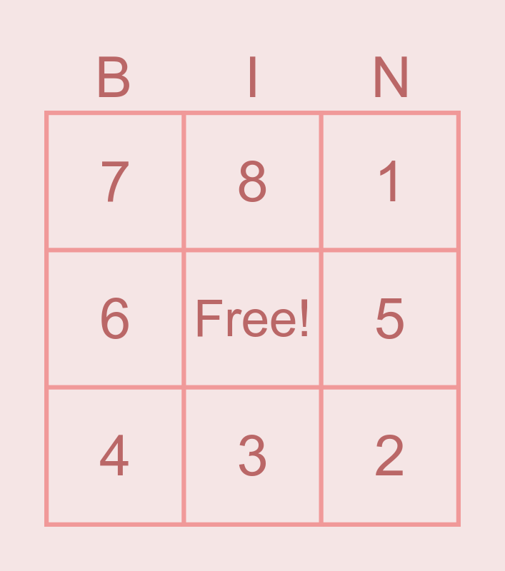 This bingo card has a free space and 8 words: 5, 1, 8, 4, 7, 2, 6 and 3.