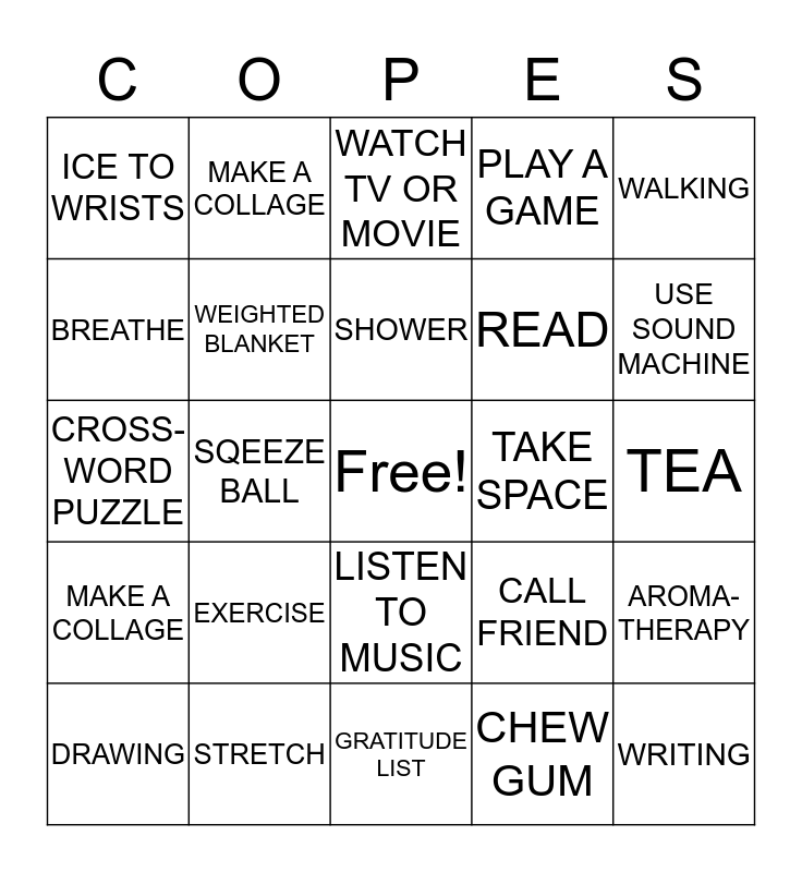 This bingo card has a free space and 24 words: EXERCISE, STRETCH, SHOWER, DRAWING, WALKING, ICE TO WRISTS, BREATHE, MAKE A COLLAGE, TAKE SPACE, LISTEN TO MUSIC, READ, CROSS- WORD PUZZLE, CALL FRIEND, AROMA- THERAPY, WEIGHTED BLANKET, CHEW GUM, TEA, WATCH TV OR MOVIE, USE SOUND MACHINE, SQEEZE BALL, WRITING, MAKE A COLLAGE, PLAY A GAME and GRATITUDE LIST.