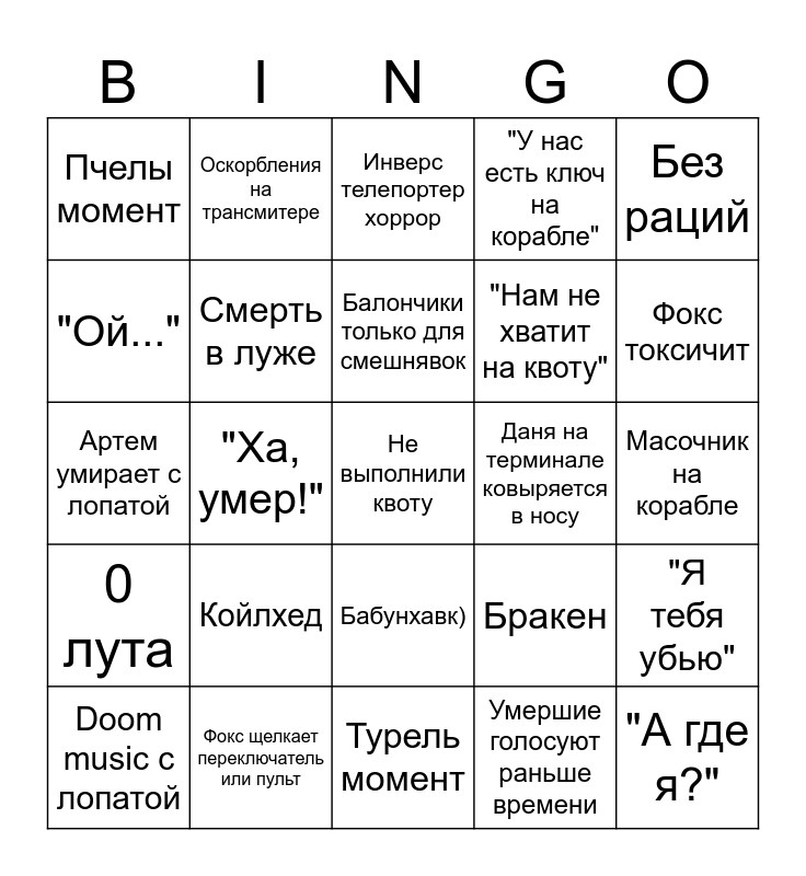 This bingo card has a free space and 34 words: Двигание мебели на орбите, Умершие голосуют раньше времени, Эджинг, Выходы напротив друг друга, 0 лута, Смерть в луже, Без раций, Doom music с лопатой, Оскорбления на трансмитере, Найденный лут оставлен у выхода, Балончики только для смешнявок, Инверс телепортер хоррор, Аутизм при наличии бумбокса, Даню забивают лопатой, Даня на терминале ковыряется в носу, Фокс токсичит, Фокс щелкает переключатель или пульт, Артем умирает с лопатой, Койлхед, Бракен, Бабунхавк), Тампер при входе, Пчелы момент, Масочник на корабле, Турель момент, "А где я?", "У нас есть ключ на корабле", "Как я выжил?", "Нам не хватит на квоту", "Ой...", "У вас там будет прикольчик", "Ха, умер!", "Я тебя убью" and "Чипи чипи чапа чапа".