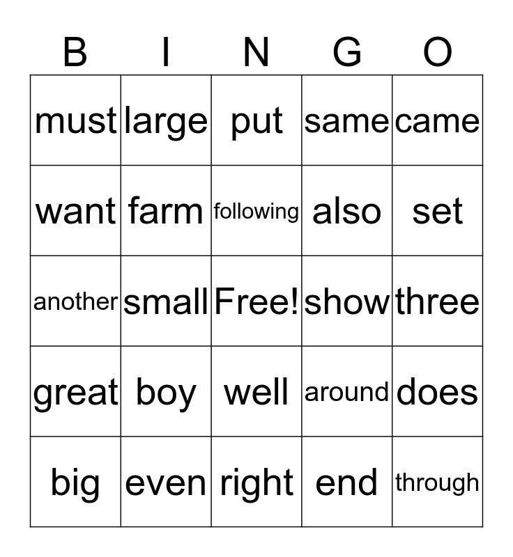 This bingo card has a free space and 24 words: boy, even, following, big, came, must, want, large, show, well, also, another, around, does, farm, end, three, put, set, small, through, great, same and right.
