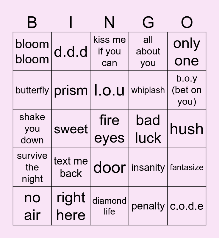 This bingo card has a free space and 24 words: text me back, right here, l.o.u, no air, only one, bloom bloom, butterfly, d.d.d, bad luck, door, whiplash, shake you down, insanity, fantasize, prism, penalty, hush, kiss me if you can, b.o.y (bet on you), sweet, c.o.d.e, survive the night, all about you and diamond life.