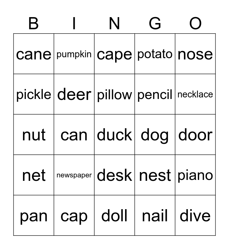 This bingo card has a free space and 30 words: cap, car, can, cow, cane, cape, deer, desk, dog, doll, door, dive, nail, neck, necklace, needle, nest, net, newspaper, nose, nut, pig, pumpkin, pencil, pickle, potato, piano, pan, pillow and paint.