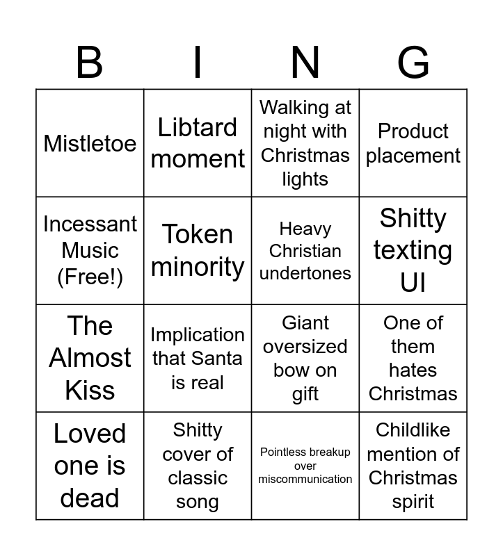 This bingo card has 16 words: Shitty cover of classic song, One of them hates Christmas, Walking at night with Christmas lights, Mistletoe, The Almost Kiss, Libtard moment, Giant oversized bow on gift, Pointless breakup over miscommunication, Incessant Music (Free!), Token minority, Loved one is dead, Product placement, Implication that Santa is real, Shitty texting UI, Heavy Christian undertones and Childlike mention of Christmas spirit.