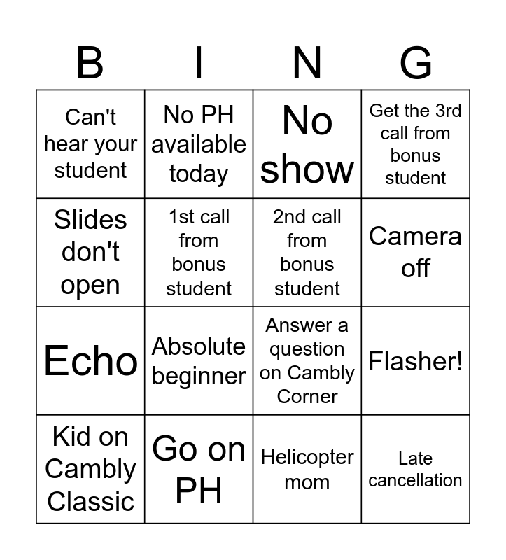 This bingo card has 16 words: Kid on Cambly Classic, Go on PH, No show, Get the 3rd call from bonus student, Slides don't open, No PH available today, Answer a question on Cambly Corner, Flasher!, Can't hear your student, 1st call from bonus student, Helicopter mom, Camera off, Echo, Absolute beginner, 2nd call from bonus student and Late cancellation.