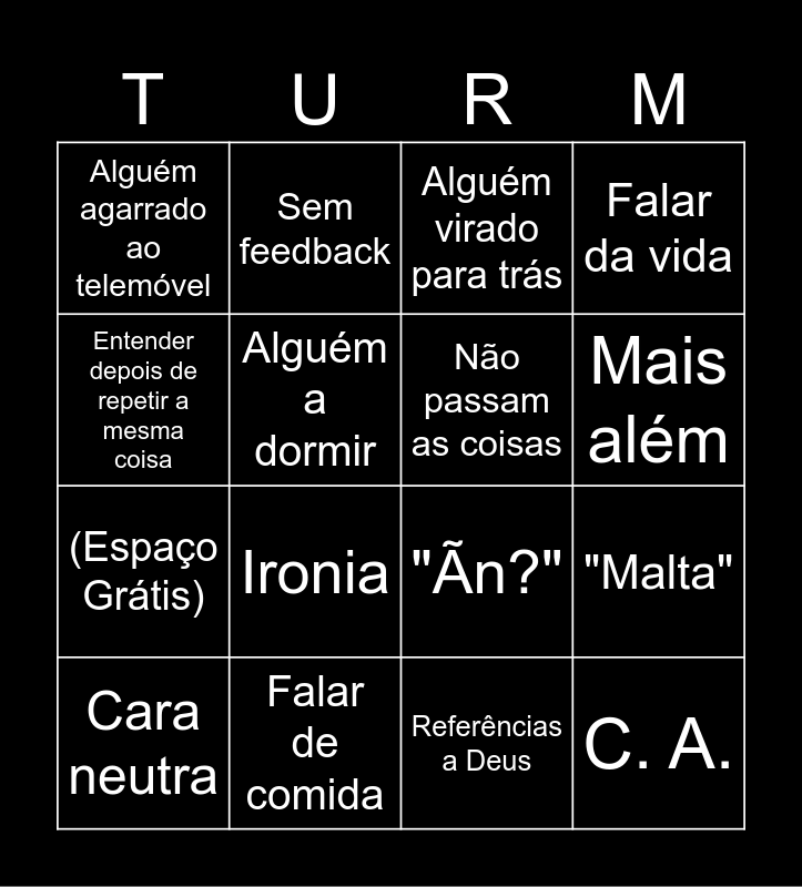 This bingo card has 20 words: "Malta", Audição Seletiva, Alguém virado para trás, Jogos na calculadora, Cara neutra, Entender depois de repetir a mesma coisa, Falar de comida, Alguém agarrado ao telemóvel, (Espaço Grátis), Sem feedback, Ironia, "Ãn?", Alguém a dormir, C. A., Não passam as coisas, 🫶, Mais além, Falar da vida, Referências a Deus and Listas.