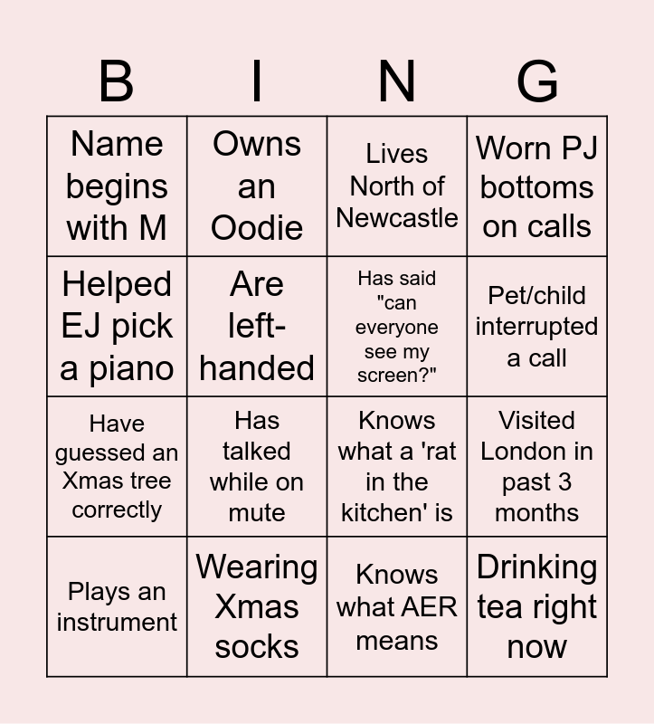 This bingo card has 16 words: Wearing Xmas socks, Visited London in past 3 months, Lives North of Newcastle, Name begins with M, Have guessed an Xmas tree correctly, Owns an Oodie, Knows what a 'rat in the kitchen' is, Knows what AER means, Helped EJ pick a piano, Are left-handed, Plays an instrument, Worn PJ bottoms on calls, Has talked while on mute, Pet/child interrupted a call, Has said "can everyone see my screen?" and Drinking tea right now.