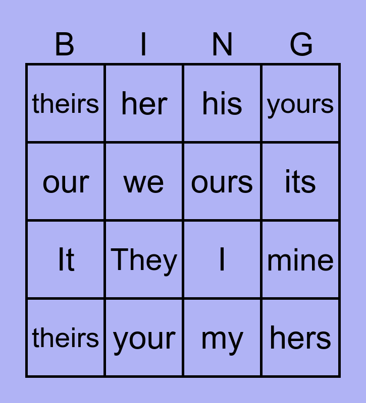 This bingo card has 16 words: your, mine, his, theirs, It, her, I, my, our, we, theirs, yours, They, its, ours and hers.