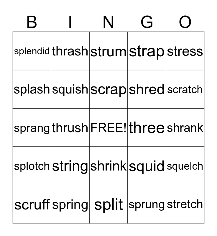 This bingo card has a free space and 24 words: string, spring, scrap, scruff, stress, splendid, splash, thrash, three, shrink, shred, sprang, squid, squelch, squish, sprung, shrank, strum, scratch, thrush, stretch, splotch, strap and split.