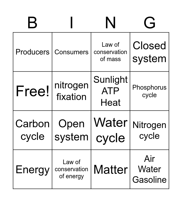 This bingo card has 16 words: Law of conservation of energy, Nitrogen cycle, Law of conservation of mass, Producers, Carbon cycle, Consumers, Water cycle, Matter, Free!, nitrogen fixation, Energy, Closed system, Open system, Phosphorus cycle, Sunlight ATP Heat and Air Water Gasoline.