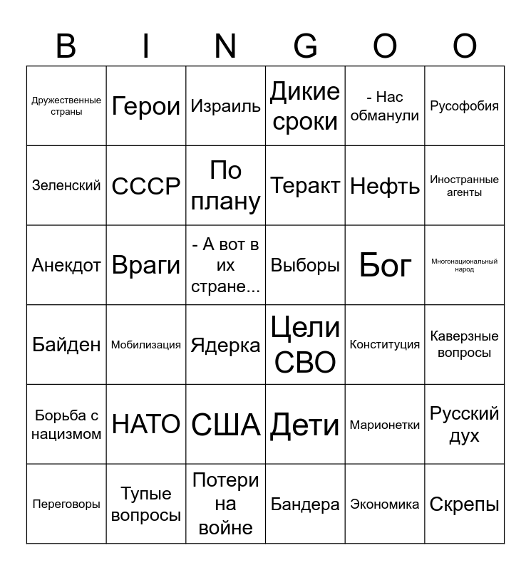 This bingo card has 36 words: Дети, США, Бандера, Зеленский, Байден, Выборы, СССР, Потери на войне, - Нас обманули, Марионетки, Иностранные агенты, Дикие сроки, Русский дух, Враги, Теракт, Дружественные страны, Борьба с нацизмом, Бог, Анекдот, Израиль, - А вот в их стране..., Мобилизация, Цели СВО, Ядерка, Конституция, Герои, Нефть, Тупые вопросы, По плану, Русофобия, Скрепы, Переговоры, Каверзные вопросы, Многонациональный народ, НАТО and Экономика.