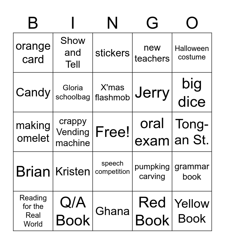 This bingo card has a free space and 29 words: Sandy and Sue, Q/A Book, stickers, telephone teaching, Halloween costume, orange card, Gloria schoolbag, X'mas flashmob, oral exam, grammar book, Reading for the Real World, crappy Vending machine, Red Book, Yellow Book, making omelet, movie day, Ghana, pumpking carving, big dice, Brian, Kristen, John, Jerry, Tong-an St., Candy, Show and Tell, speech competition, new teachers and BBQ.