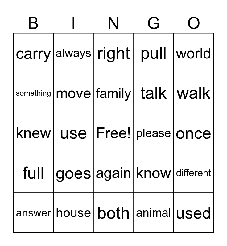 This bingo card has a free space and 24 words: goes, house, family, answer, world, carry, something, always, please, again, talk, knew, know, different, move, animal, once, right, walk, use, used, full, pull and both.