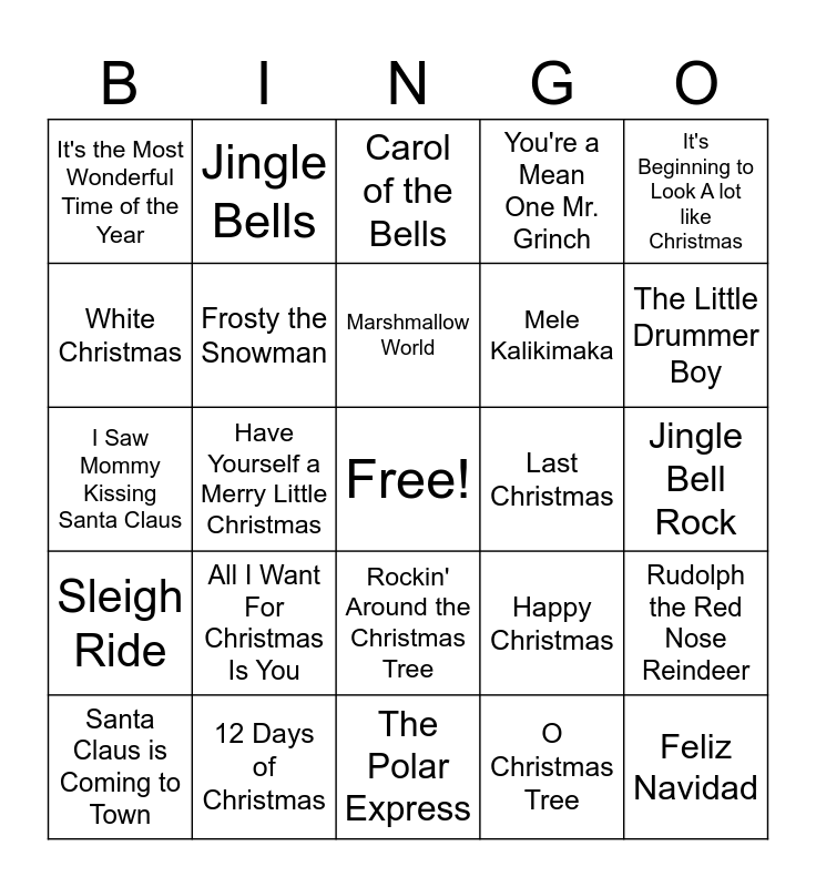 This bingo card has a free space and 24 words: All I Want For Christmas Is You, 12 Days of Christmas, Marshmallow World, Santa Claus is Coming to Town, It's Beginning to Look A lot like Christmas, It's the Most Wonderful Time of the Year, White Christmas, Jingle Bells, Last Christmas, Rockin' Around the Christmas Tree, Mele Kalikimaka, I Saw Mommy Kissing Santa Claus, Happy Christmas, Rudolph the Red Nose Reindeer, Frosty the Snowman, O Christmas Tree, Jingle Bell Rock, Carol of the Bells, The Little Drummer Boy, Have Yourself a Merry Little Christmas, Feliz Navidad, Sleigh Ride, You're a Mean One Mr. Grinch and The Polar Express.