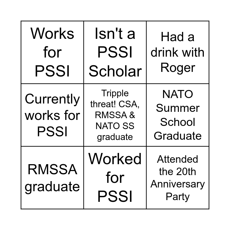 This bingo card has a free space and 15 words: CSA graduate, Works for a foreign government, Had a drink with Roger, Works for PSSI, Worked for PSSI, Attended the 20th Anniversary Party, NATO Summer School graduate, RMSSA graduate, NATO Summer School Graduate, Works for the Czech government, Is here only for the food, Currently works for PSSI, RMSSA graduate, Isn't a PSSI Scholar and Had a drink with Boris.