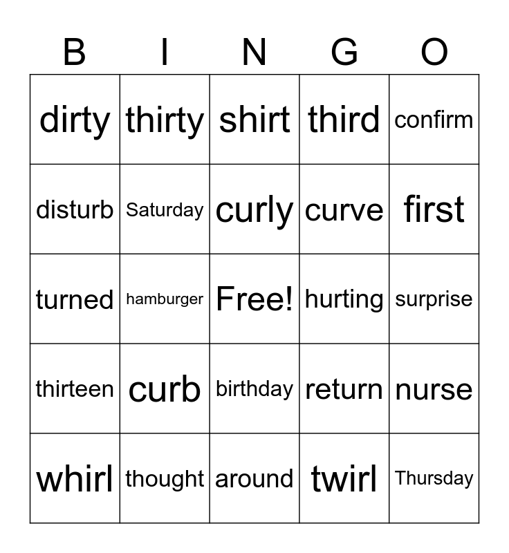 This bingo card has a free space and 28 words: nurse, Thursday, curve, twirl, disturb, shirt, thirty, thirteen, hurting, whirl, turned, third, thought, around, first, burned, curb, Saturday, curly, birthday, dirty, squirt, Thursday, hamburger, surprise, return, confirm and return.