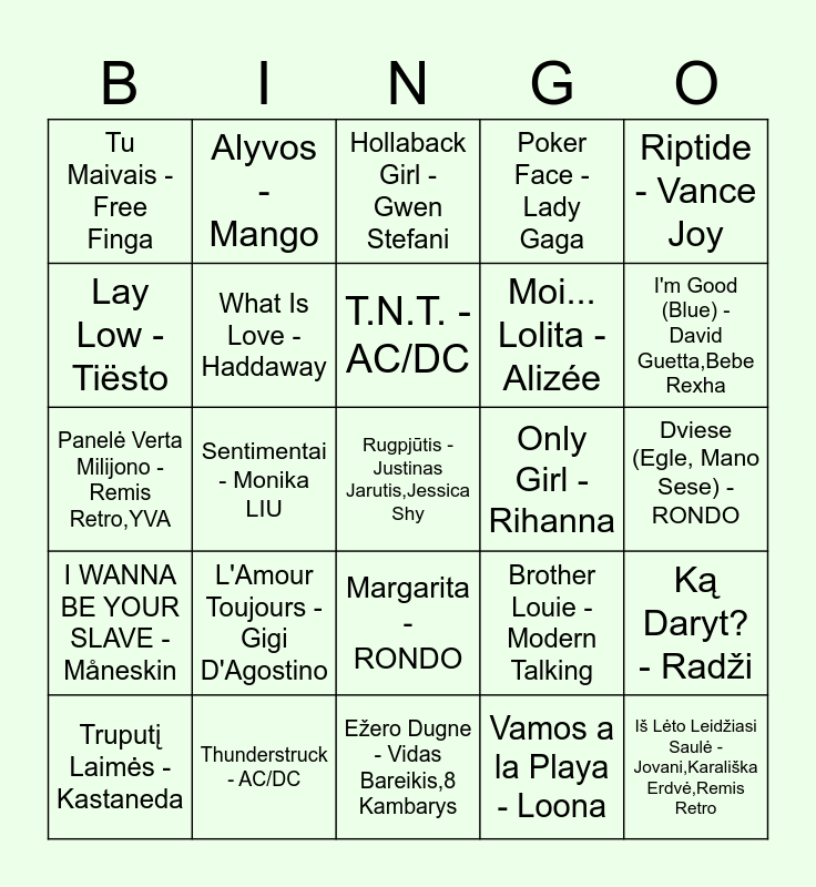 This bingo card has 103 words: Bella Ciao - Becky G, Bad guy - Billie Eilish, Riptide - Vance Joy, Can't Hold Us - Macklemore & Ryan Lewis, Without Me - Eminem, Roses - SAINt JHN,Imanbek, I Took A Pill In Ibiza - Mike Posner,Seeb, Last Christmas - Wham!, Flowers - Miley Cyrus, Everybody (Backstreet's Back) - Backstreet Boys, The Rhythm of the Night - Corona, Sweet Dreams - Eurythmics,Annie Lennox,Dave Stewart, Don't Stop The Music - Rihanna, Hey Ya! - Outkast, SexyBack - Justin Timberlake,Timbaland, In Da Club - 50 Cent, Hollaback Girl - Gwen Stefani, Oops! I Did It Again - Britney Spears, Ice Ice Baby - Vanilla Ice, The Real Slim Shady - Eminem, Butterfly - Crazy Town, Smells Like Teen Spirit - Nirvana, Take on Me - a-ha, Girls Just Want to Have Fun - Cyndi Lauper, Makeba - Jain,Ian Asher, L'Amour Toujours - Gigi D'Agostino, I'm Good (Blue) - David Guetta,Bebe Rexha, Poker Face - Lady Gaga, Tokyo Drift - Teriyaki Boyz, Stayin Alive - Bee Gees, Brother Louie - Modern Talking, Vamos a la Playa - Loona, Tacata- Tacabro, Dance Monkey - Tones And I, Billie Jean - Michael Jackson, Don't Stop Me Now - Queen, Another One Bites The Dust - Queen, It's My Life - Bon Jovi, T.N.T. - AC/DC, Thunderstruck - AC/DC, ZITTI E BUONI - Måneskin, I WANNA BE YOUR SLAVE - Måneskin, I Was Made For Lovin' You - KISS, Lay Low - Tiësto, Sindikato Smogikai - G&G Sindikatas, Tu Maivais - Free Finga, Kevinas Durantas - OG Version, Rugpjūtis - Justinas Jarutis,Jessica Shy, Kunigunda - Vaidas Baumila, Iš Lėto Leidžiasi Saulė - Jovani,Karališka Erdvė,Remis Retro, Tavo Svajonė - Andrius Mamontovas, Nebenoriu Laukt - Džordana Butkutė, Juoda Orchidėja - MG INTERNATIONAL, Melodramos - Rokas Yan,Evgenya Redko, Tyliai Pakuždėk - Jessica Shy,Nombeko Auguste, Važiuoju Kur Širdis - GJan, Dūšia - Leon Somov,Monika Linkyte, Norim Šokti - Saulius Prūsaitis, Trys Milijonai - Marijonas Mikutavičius, Margarita - RONDO, Dviese (Egle, Mano Sese) - RONDO, Vienas Namuose - Džordana Butkutė, Kai sirpsta vyšnios Suvalkijoj - Vytautas Kernagis, Lūpytės - Baltasis Kiras, Velniškas Greitis - 69 Danguje, Jei Leisi - Gabrielius Vagelis,69 Danguje, Vėjai - Gabrielius Vagelis, Alyvos - Mango, Panelė Verta Milijono - Remis Retro,YVA, Sentimentai - Monika LIU, Ežero Dugne - Vidas Bareikis,8 Kambarys, Sel 600 - Sel, Žalia Sierra - DJ Dalgis, Tu Privalai Skambėt - Lilas ir Innomine, Vėl Švieski - Stasys Povilaitis, A Song to Live - Beissoul & Einius, Nervai - Vidas Bareikis, Truputį Laimės - Kastaneda, Aš Noriu Šokt - Karališka erdvė, Discoteque - THE ROOP, Danza Kuduro - Lucenzo,Don Omar, Relax, Take It Easy - MIKA, What Is Love - Haddaway, Alors on danse - Stromae, Only Girl - Rihanna, Be My Lover - La Bouche, Rhythm Is a Dancer - SNAP!, Macarena - Los Del Rio, (I Just) Died In Your Arms - Cutting Crew, U Can't Touch This - MC Hammer, Yeah! - USHER,Lil Jon,Ludacris, Never Gonna Give You Up - Rick Astley, Ką Daryt? - Radži, Robinzonas - Vitalija Katunskytė, Barbie Girl - Aqua, Eye of the Tiger - Survivor, Moi... Lolita - Alizée, Thunder - Imagine Dragons, Voyage voyage - Desireless, Pump Up The Jam - Technotronic, Umbrella - Rihanna,JAY-Z, Gasolina - Daddy Yankee and Super Freak - Rick James.