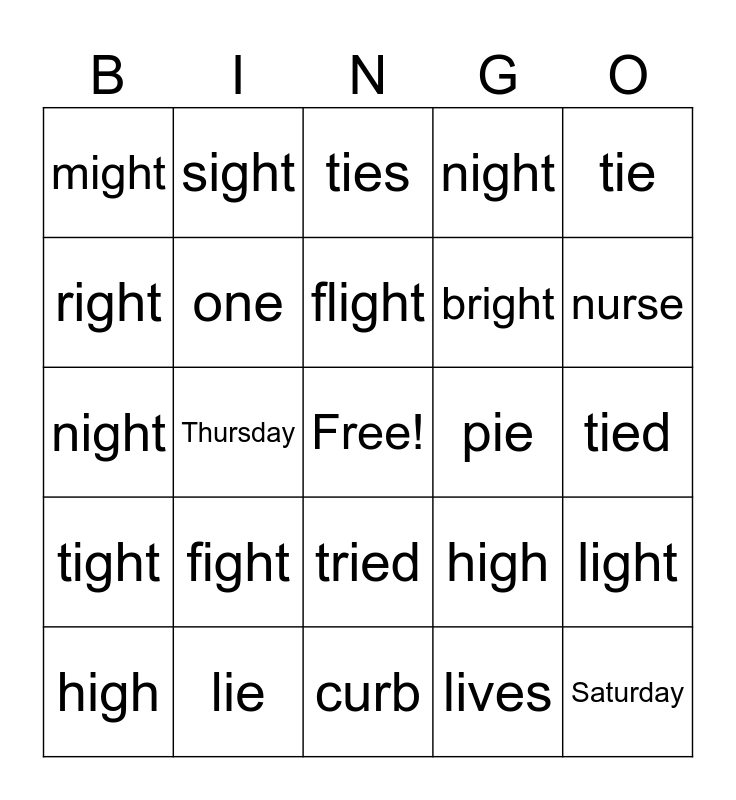 This bingo card has a free space and 24 words: fight, lie, flight, high, tie, might, right, sight, pie, tried, bright, night, high, light, one, lives, tied, ties, nurse, Thursday, Saturday, tight, night and curb.