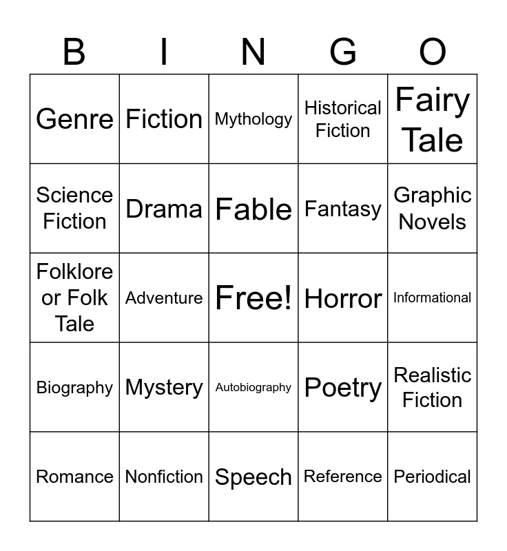This bingo card has a free space and 24 words: Mystery, Nonfiction, Fable, Romance, Fairy Tale, Genre, Science Fiction, Fiction, Horror, Autobiography, Fantasy, Folklore or Folk Tale, Poetry, Realistic Fiction, Drama, Reference, Informational, Mythology, Graphic Novels, Adventure, Periodical, Biography, Historical Fiction and Speech.