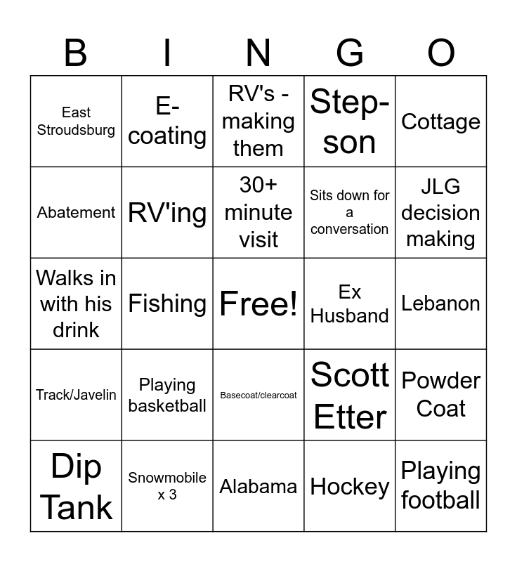 This bingo card has a free space and 30 words: Snowmobile x 3, Sled x 3, Fishing, Canada, East Stroudsburg, RV's - making them, RV'ing, Basecoat/clearcoat, Ex Husband, Alabama, Lebanon, Playing football, Hockey, Corvette, JLG decision making, Internaltional paint, Scott Etter, Track/Javelin, Playing basketball, Cottage, Walks in with his drink, Retirement plan, E-coating, Sits down for a conversation, Abatement, Step-son, Powder Coat, Dip Tank, 30+ minute visit and Tennessee.