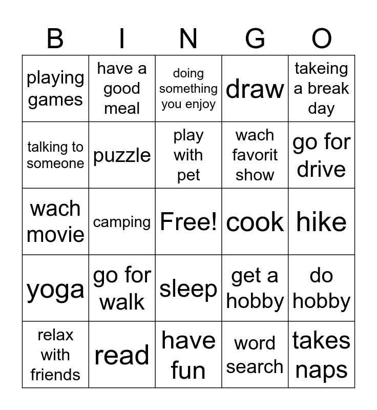 This bingo card has a free space and 24 words: go for walk, read, play with pet, relax with friends, takeing a break day, playing games, talking to someone, have a good meal, cook, sleep, wach favorit show, wach movie, get a hobby, do hobby, puzzle, word search, hike, doing something you enjoy, go for drive, camping, takes naps, yoga, draw and have fun.