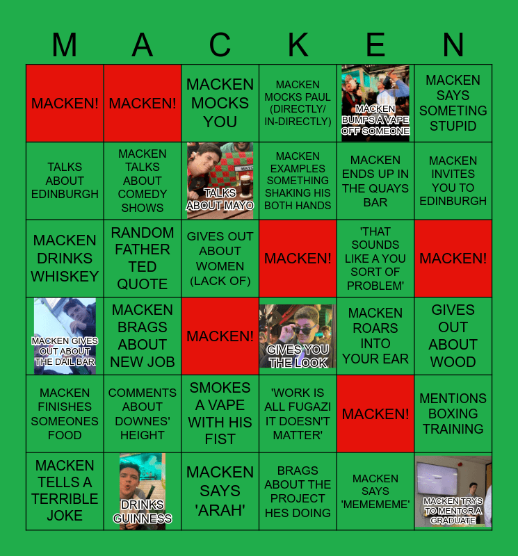 This bingo card has 6 images and 36 words: MACKEN GIVES OUT ABOUT THE DAIL BAR, MACKEN BRAGS ABOUT NEW JOB, MACKEN SAYS 'ARAH', MACKEN EXAMPLES SOMETHING SHAKING HIS BOTH HANDS, 'THAT SOUNDS LIKE A YOU SORT OF PROBLEM', MACKEN!, MACKEN!, DRINKS GUINNESS, MACKEN MOCKS YOU, 'WORK IS ALL FUGAZI IT DOESN'T MATTER', MACKEN ENDS UP IN THE QUAYS BAR, MACKEN SAYS SOMETING STUPID, MACKEN FINISHES SOMEONES FOOD, RANDOM FATHER TED QUOTE, TALKS ABOUT MAYO, MACKEN MOCKS PAUL (DIRECTLY/ IN-DIRECTLY), MACKEN!, GIVES OUT ABOUT WOOD, TALKS ABOUT EDINBURGH, MACKEN TALKS ABOUT COMEDY SHOWS, MACKEN!, GIVES YOU THE LOOK, MACKEN ROARS INTO YOUR EAR, MENTIONS BOXING TRAINING, MACKEN DRINKS WHISKEY, MACKEN!, GIVES OUT ABOUT WOMEN (LACK OF), BRAGS ABOUT THE PROJECT HES DOING, MACKEN BUMPS A VAPE OFF SOMEONE, MACKEN INVITES YOU TO EDINBURGH, MACKEN TELLS A TERRIBLE JOKE, COMMENTS ABOUT DOWNES' HEIGHT, SMOKES A VAPE WITH HIS FIST, MACKEN!, MACKEN SAYS 'MEMEMEME' and MACKEN TRYS TO MENTOR A GRADUATE.