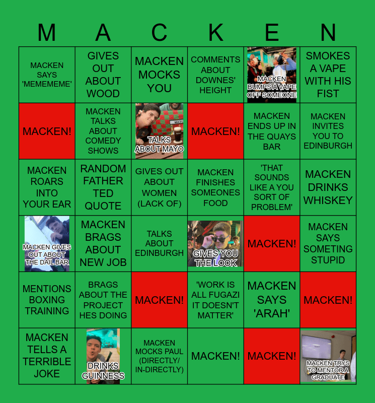 This bingo card has 6 images and 36 words: MACKEN GIVES OUT ABOUT THE DAIL BAR, MACKEN BRAGS ABOUT NEW JOB, MACKEN MOCKS PAUL (DIRECTLY/ IN-DIRECTLY), MACKEN!, 'THAT SOUNDS LIKE A YOU SORT OF PROBLEM', MACKEN DRINKS WHISKEY, MACKEN SAYS 'MEMEMEME', DRINKS GUINNESS, MACKEN MOCKS YOU, 'WORK IS ALL FUGAZI IT DOESN'T MATTER', MACKEN ENDS UP IN THE QUAYS BAR, SMOKES A VAPE WITH HIS FIST, MENTIONS BOXING TRAINING, RANDOM FATHER TED QUOTE, TALKS ABOUT MAYO, COMMENTS ABOUT DOWNES' HEIGHT, MACKEN SAYS 'ARAH', MACKEN SAYS SOMETING STUPID, MACKEN!, MACKEN TALKS ABOUT COMEDY SHOWS, TALKS ABOUT EDINBURGH, GIVES YOU THE LOOK, MACKEN!, MACKEN!, MACKEN ROARS INTO YOUR EAR, GIVES OUT ABOUT WOOD, GIVES OUT ABOUT WOMEN (LACK OF), MACKEN!, MACKEN BUMPS A VAPE OFF SOMEONE, MACKEN INVITES YOU TO EDINBURGH, MACKEN TELLS A TERRIBLE JOKE, BRAGS ABOUT THE PROJECT HES DOING, MACKEN!, MACKEN FINISHES SOMEONES FOOD, MACKEN! and MACKEN TRYS TO MENTOR A GRADUATE.