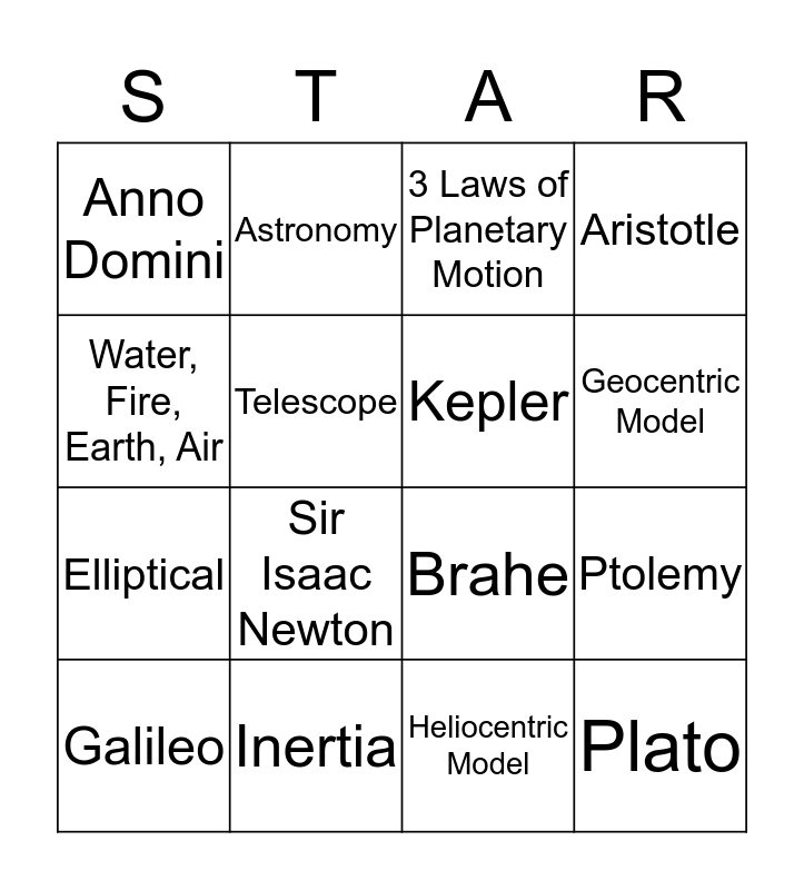 This bingo card has a free space and 15 words: Galileo, Plato, 3 Laws of Planetary Motion, Anno Domini, Geocentric Model, Water, Fire, Earth, Air, Sir Isaac Newton, Heliocentric Model, Telescope, Elliptical, Ptolemy, Aristotle, Kepler, Astronomy and Inertia.