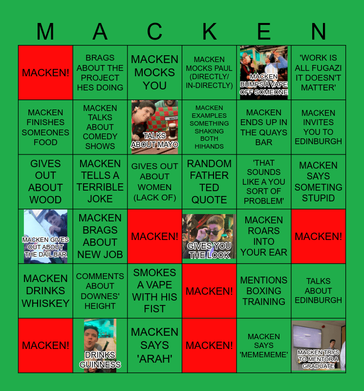 This bingo card has 6 images and 36 words: MACKEN GIVES OUT ABOUT THE DAIL BAR, MACKEN BRAGS ABOUT NEW JOB, MACKEN SAYS 'ARAH', MACKEN EXAMPLES SOMETHING SHAKING BOTH HIHANDS, 'THAT SOUNDS LIKE A YOU SORT OF PROBLEM', MACKEN SAYS SOMETING STUPID, MACKEN!, DRINKS GUINNESS, MACKEN MOCKS YOU, MACKEN!, MACKEN ENDS UP IN THE QUAYS BAR, 'WORK IS ALL FUGAZI IT DOESN'T MATTER', MACKEN DRINKS WHISKEY, MACKEN TELLS A TERRIBLE JOKE, TALKS ABOUT MAYO, MACKEN MOCKS PAUL (DIRECTLY/ IN-DIRECTLY), MENTIONS BOXING TRAINING, MACKEN!, MACKEN FINISHES SOMEONES FOOD, MACKEN TALKS ABOUT COMEDY SHOWS, MACKEN!, GIVES YOU THE LOOK, MACKEN ROARS INTO YOUR EAR, TALKS ABOUT EDINBURGH, GIVES OUT ABOUT WOOD, BRAGS ABOUT THE PROJECT HES DOING, GIVES OUT ABOUT WOMEN (LACK OF), MACKEN!, MACKEN BUMPS A VAPE OFF SOMEONE, MACKEN INVITES YOU TO EDINBURGH, MACKEN!, COMMENTS ABOUT DOWNES' HEIGHT, SMOKES A VAPE WITH HIS FIST, RANDOM FATHER TED QUOTE, MACKEN SAYS 'MEMEMEME' and MACKEN TRYS TO MENTOR A GRADUATE.
