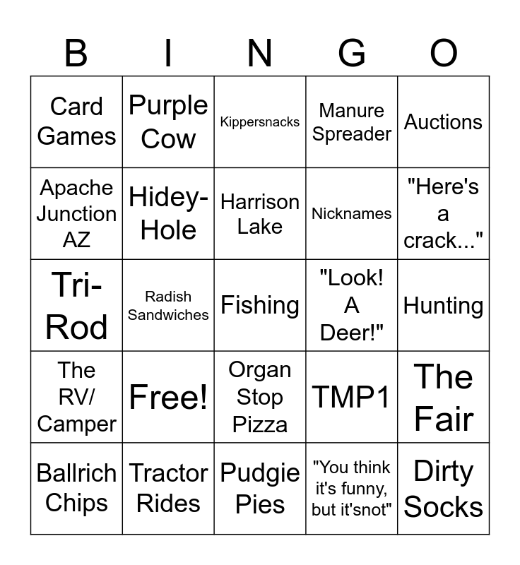 This bingo card has 25 words: Free!, Pudgie Pies, Harrison Lake, Ballrich Chips, Auctions, Card Games, Apache Junction AZ, Purple Cow, "Look! A Deer!", Organ Stop Pizza, Nicknames, Tri-Rod, TMP1, The Fair, Hidey-Hole, Dirty Socks, Hunting, Kippersnacks, "Here's a crack...", Radish Sandwiches, Fishing, Tractor Rides, The RV/ Camper, Manure Spreader and "You think it's funny, but it'snot".