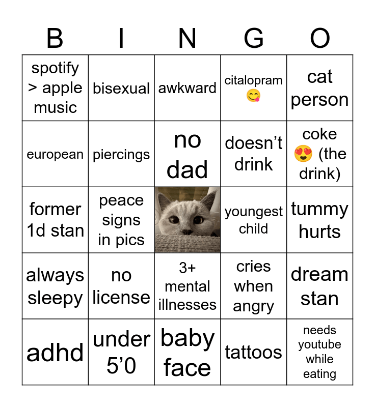 This bingo card has a free space and 24 words: no license, under 5’0, no dad, adhd, cat person, spotify > apple music, european, bisexual, youngest child, 3+ mental illnesses, doesn’t drink, former 1d stan, cries when angry, dream stan, piercings, tattoos, tummy hurts, awkward, coke 😍 (the drink), peace signs in pics, needs youtube while eating, always sleepy, citalopram 😋 and baby face.