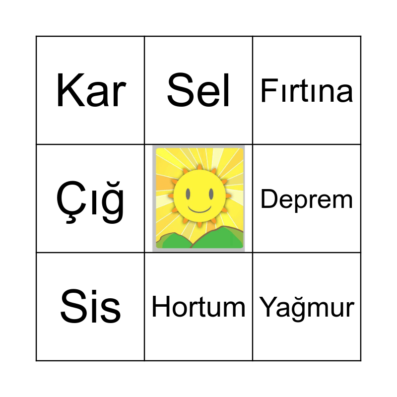 This bingo card has a free space and 8 words: Deprem, Fırtına, Sel, Sis, Kar, Yağmur, Çığ and Hortum.