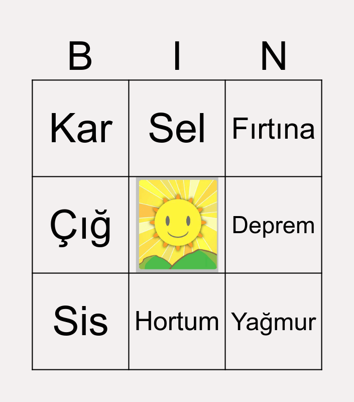 This bingo card has a free space and 8 words: Deprem, Fırtına, Sel, Sis, Kar, Yağmur, Çığ and Hortum.