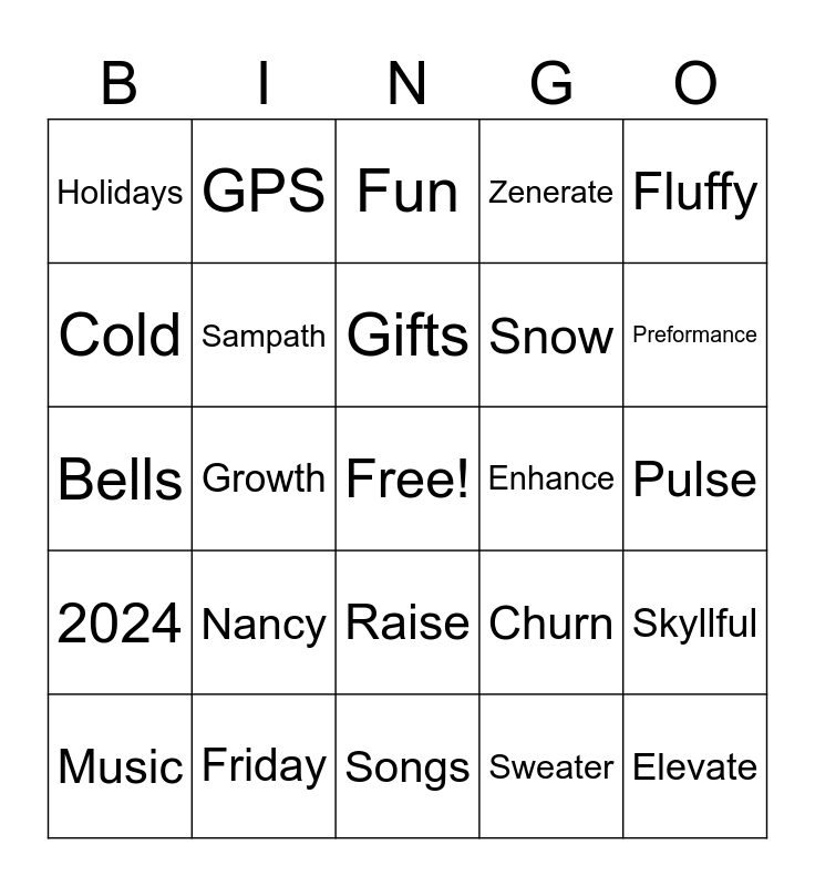 This bingo card has a free space and 29 words: Music, Goals, Growth, Development, Holidays, Fun, Sampath, Nancy, Enhance, Friday, Pulse, Elevate, Songs, Sweater, Preformance, F2F, Raise, 2024, Fluffy, Bells, Churn, Ugly, Snow, Cold, Zenerate, GPS, Skyllful, Gifts and Team.
