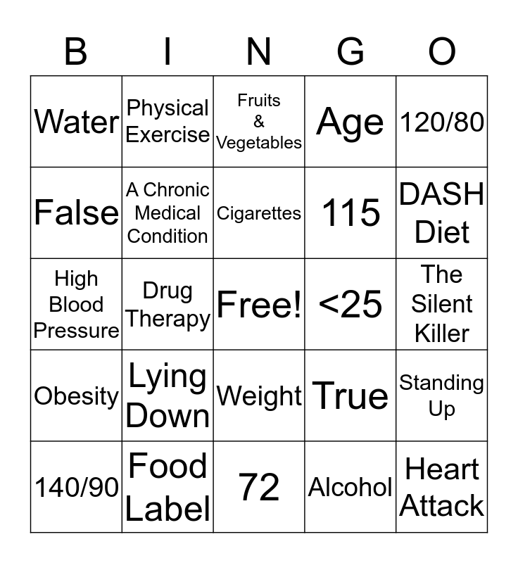 This bingo card has a free space and 24 words: Lying Down, Food Label, Cigarettes, 140/90, 120/80, Water, False, Physical Exercise, <25, Weight, 115, High Blood Pressure, True, Standing Up, A Chronic Medical Condition, Alcohol, The Silent Killer, Fruits & Vegetables, DASH Diet, Drug Therapy, Heart Attack, Obesity, Age and 72.