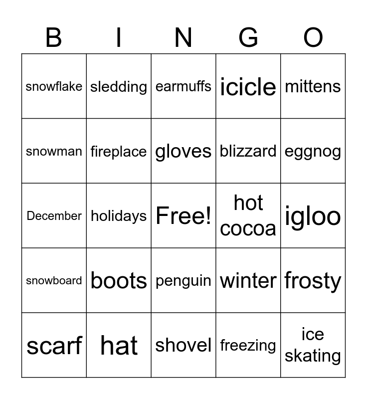 This bingo card has a free space and 24 words: boots, hat, gloves, scarf, mittens, snowflake, snowman, sledding, hot cocoa, penguin, blizzard, December, winter, frosty, fireplace, freezing, igloo, earmuffs, eggnog, holidays, ice skating, snowboard, icicle and shovel.