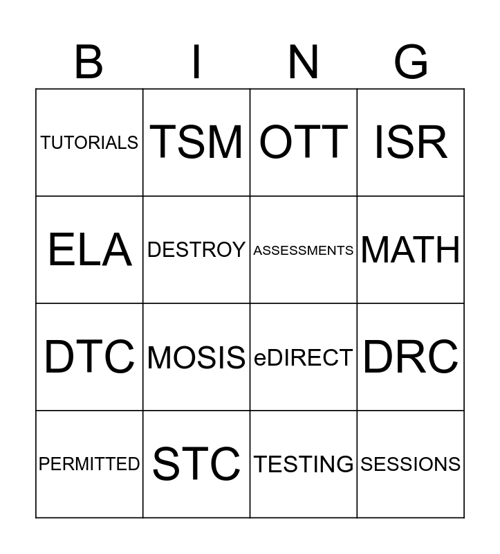 This bingo card has a free space and 30 words: EXAMINER, ONLINE TOOLS, DRC, PROCTOR, TUTORIALS, OTT, ASSESSMENTS, INSIGHT, STC, MATERIALS, TESTING, PERMITTED, SECURELY, CALCULATOR, MOSIS, TEST TICKET, DESTROYED, GAMING, COLLECT, ELA, SESSIONS, LOGGED OUT, TSM, DTC, DESTROY, ISR, SCIENCE, ELA, MATH and DESE.