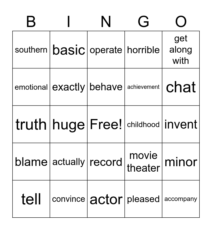 This bingo card has a free space and 50 words: accent, accompany, accurate, actor, actually, alter, basic, detail, emotional, each other, exactly, horrible, minor, movie theater, research, significant, behave, childhood, contact, get along with, huge, pleased, southern, achievement, appreciate, camera, chat, gloves, operate, record, seaside, apologize, be responsible for, condition, convince, doubt, encourage, even, hug, invent, minister, otherwise, president, tax, tell, truth, twice, afford, blame and enemy.