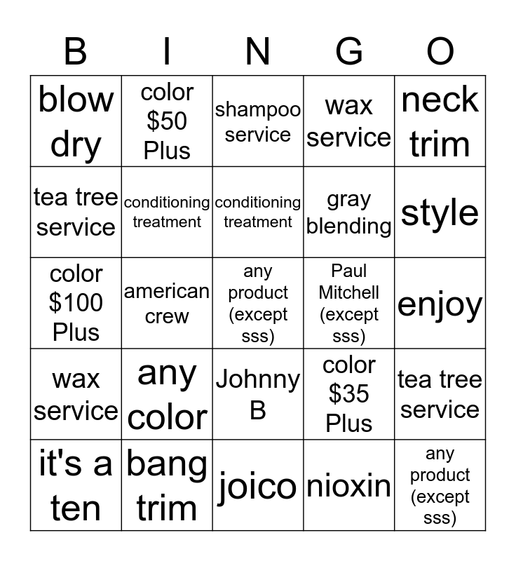 This bingo card has a free space and 24 words: any color, bang trim, conditioning treatment, it's a ten, neck trim, blow dry, tea tree service, color $50 Plus, Paul Mitchell (except sss), Johnny B, gray blending, color $100 Plus, color $35 Plus, tea tree service, conditioning treatment, nioxin, enjoy, shampoo service, style, american crew, any product (except sss), wax service, wax service and joico.