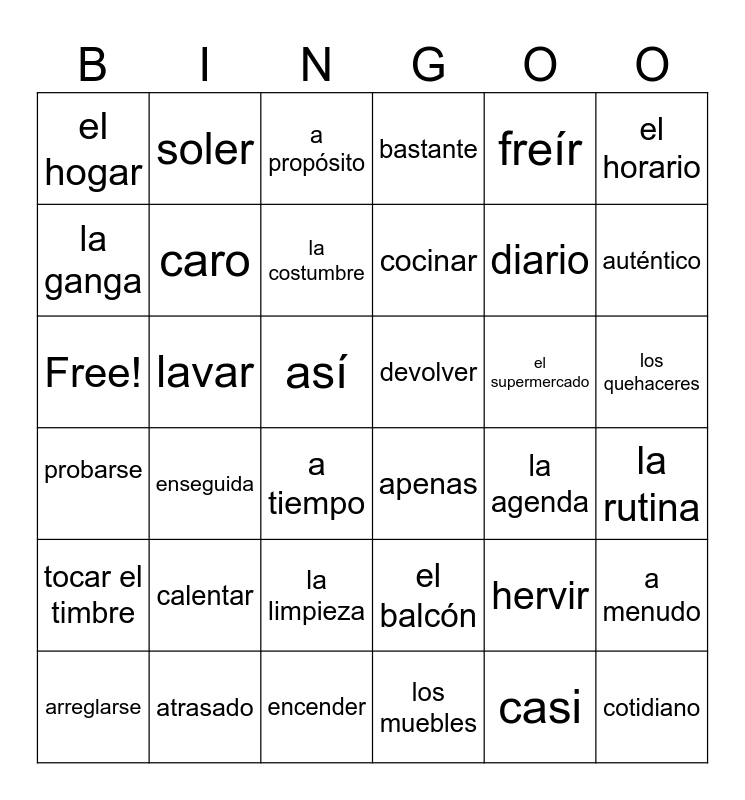 This bingo card has 36 words: el balcón, la limpieza, los muebles, la ganga, probarse, devolver, caro, encender, freír, hervir, auténtico, bastante, a menudo, lavar, cocinar, el hogar, tocar el timbre, el supermercado, Free!, a propósito, así, enseguida, apenas, a tiempo, la agenda, soler, diario, atrasado, la costumbre, el horario, cotidiano, arreglarse, la rutina, los quehaceres, calentar and casi.