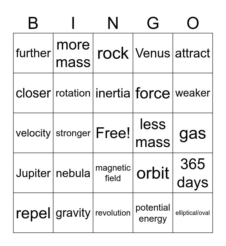 This bingo card has a free space and 24 words: nebula, gravity, inertia, repel, attract, further, closer, more mass, less mass, magnetic field, force, velocity, orbit, 365 days, rotation, potential energy, gas, rock, weaker, stronger, elliptical/oval, Jupiter, Venus and revolution.