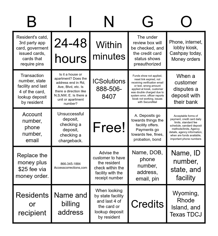 This bingo card has a free space and 24 words: Residents or recipient, 866-345-1884 Accesscorrections,com, ICSolutions 888-506-8407, Credits, Phone, internet, lobby kiosk, Cashpay today, Money orders, Resident's catd, 3rd party app card, goverment issued cards, cards that require pins, 24-48 hours, Within minutes, A. Deposits go towards things the facility offers. Payments go towards fee, fines, probation, bond, Acceptable forms of payment, credit card daily limits, standard fee schedule, sandard deposit methods/limits, Agency details, agency information, when are funds available, important phone numbers, Account number, phone number, email, Is it a house or apartment? Does the address end in Rd, Ave, Blvd, etc. Is there a direction like N,S,NW, E. Is there a unit or apartment number?, Name, DOB, phone number, address, email, pin, Name, ID number, state, and facility, Transaction number, state facility and last 4 of the card, lookup deposit by resident, Name and billing address, When looking by state facility and last 4 of the card or lookup deposit by resident, The under review box will be checked, and the credit card status shows preauthorized, When a customer disputes a deposit with their bank, Replace the money plus $25 fee via money order., Unsuccessful deposit, checking a deposit, checking a chargeback., Advise the customer to have the resident check within the facility with the receipt number, Funds show not applied, reset link expired, not receiving verification email or text, wrong amount applied at kiosk, customer was double charged due to system error, officer reports kiosk not working, issues with SecureMail and Wyoming, Rhode Island, and Texas TDCJ.