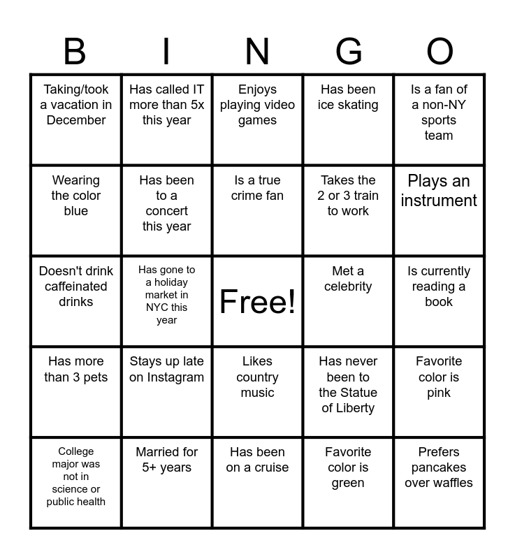 This bingo card has a free space and 24 words: Stays up late on Instagram, Married for 5+ years, Is a true crime fan, College major was not in science or public health, Is a fan of a non-NY sports team, Taking/took a vacation in December, Wearing the color blue, Has called IT more than 5x this year, Met a celebrity, Likes country music, Takes the 2 or 3 train to work, Doesn't drink caffeinated drinks, Has never been to the Statue of Liberty, Favorite color is pink, Has been to a concert this year, Favorite color is green, Is currently reading a book, Enjoys playing video games, Plays an instrument, Has gone to a holiday market in NYC this year, Prefers pancakes over waffles, Has more than 3 pets, Has been ice skating and Has been on a cruise.