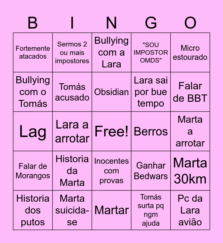 This bingo card has a free space and 42 words: Ft. Claudia patricia, Obsidian, Lara a reclamar com os gatos, Historia da Marta, Tomás surta pq ngm ajuda, Marta 30km, Pc da Lara avião, Risinhos, Bullying com a Lara, Inocentes com provas, Marta a arrotar, Falar de BBT, Lara a arrotar, Micro estourado, Piadas à Gil, Ganhar Bedwars, Não se ouve o Tomás, Lag, Lara acusada, Sermos 2 ou mais impostores, Bullying com o Tomás, O mapa, A gente mata-se no among us, Fortemente atacados, Casa de banho, Ta doida, Lara sai por bue tempo, Jogada epica, Pc do Tomás morre, Funk a toa, Videos alto (geral), Falar de Morangos, Tomás acusado, Martar, Lara demora a entrar/a chegar, Historia dos putos, Marta suicida-se, Berros, Repetir o codigo do among 1000 vezes, OH TOMAS COMEÇA, "SOU IMPOSTOR OMDS" and Marta acusada.