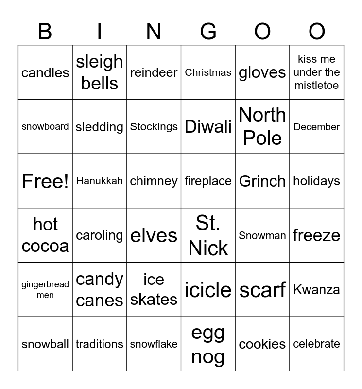 This bingo card has 36 words: icicle, ice skates, egg nog, snowboard, hot cocoa, fireplace, sledding, snowflake, gloves, scarf, December, Christmas, Kwanza, Hanukkah, Diwali, candles, gingerbread men, Grinch, Free!, reindeer, chimney, caroling, St. Nick, elves, Snowman, sleigh bells, North Pole, traditions, Stockings, kiss me under the mistletoe, celebrate, snowball, freeze, holidays, candy canes and cookies.