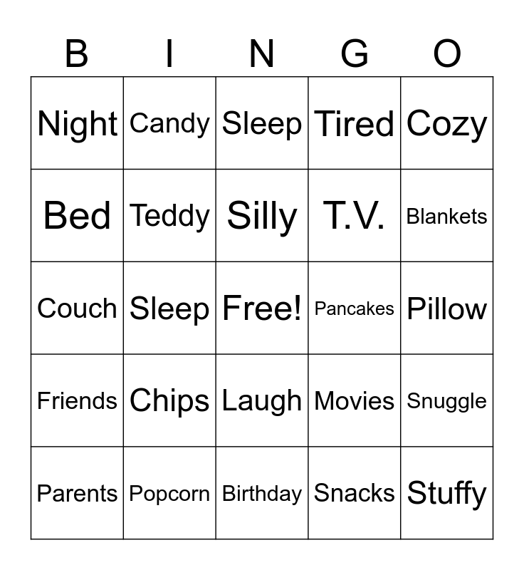 This bingo card has a free space and 24 words: Chips, Popcorn, Silly, Parents, Cozy, Night, Bed, Candy, Pancakes, Laugh, T.V., Couch, Movies, Snuggle, Teddy, Snacks, Pillow, Sleep, Blankets, Sleep, Stuffy, Friends, Tired and Birthday.