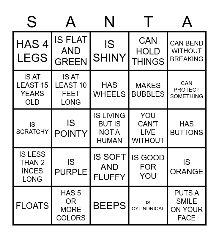 This bingo card has 25 words: IS PURPLE, BEEPS, HAS WHEELS, FLOATS, CAN BEND WITHOUT BREAKING, HAS 4 LEGS, IS AT LEAST 15 YEARS OLD, IS FLAT AND GREEN, YOU CAN'T LIVE WITHOUT, IS SOFT AND FLUFFY, MAKES BUBBLES, IS SCRATCHY, IS GOOD FOR YOU, IS ORANGE, IS AT LEAST 10 FEET LONG, PUTS A SMILE ON YOUR FACE, HAS BUTTONS, IS SHINY, CAN PROTECT SOMETHING, IS POINTY, IS LIVING BUT IS NOT A HUMAN, HAS 5 OR MORE COLORS, IS LESS THAN 2 INCES LONG, CAN HOLD THINGS and IS CYLINDRICAL.
